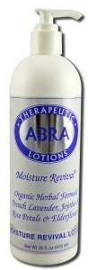 Front label panel: ABRA THERAPEUTIC LOTIONS Revitalize Dry Skin Organic Herbal Formula French Lavender, Jojoba Oil St. Johns Wort Wild Yam MOISTURE REVIVAL LOTION Net Wt 16 fl. oz (475ml) Instructions: DIRECTIONS Use generously on hands and body. Ingredients: Organic Lavandula angustifolia water (lavender), organic Aloe vera, organic Simmondsia chinensis oil (jojoba), organic Cocos nucifera oil (coconut), organic Olea europaea oil (olive): vegetable glycerin (coconut), glyceryl stearate (coconut), vegetable emulsifying wax (coconut), Organic Hypericum perforatum (St. John's Wort), Wildcrafted Dioscorea villosa (wild yam), Essential oils of Lavandula angustifolia (lavender), Boswellia olibanum (frankincense), sodium PCA, grapefruit seed extract, phenoxyethanol, allantoin, Olea europaea leaf extract (olive). Supplemental Facts: Mositure Revival Lotion Replenish Lost Moisture Restore Soft, Supple Skin Tone Organic Herbal Extracts and Essential Oils No Parabens or Artificial Fragrance Whole Herb Extracts Medicinal grade herbs are used to make the concentrated extracts for this therapeutic herbal lotion.